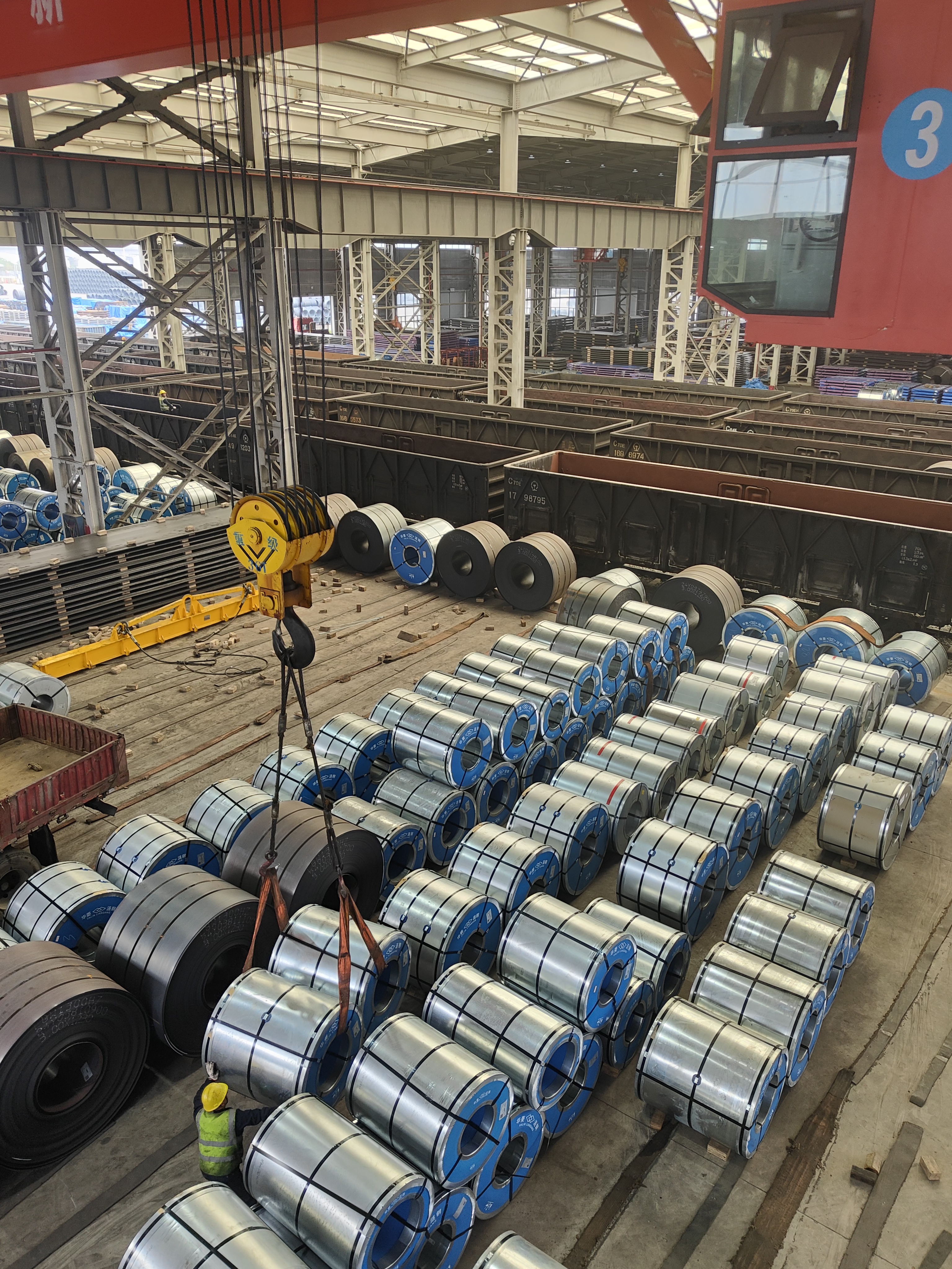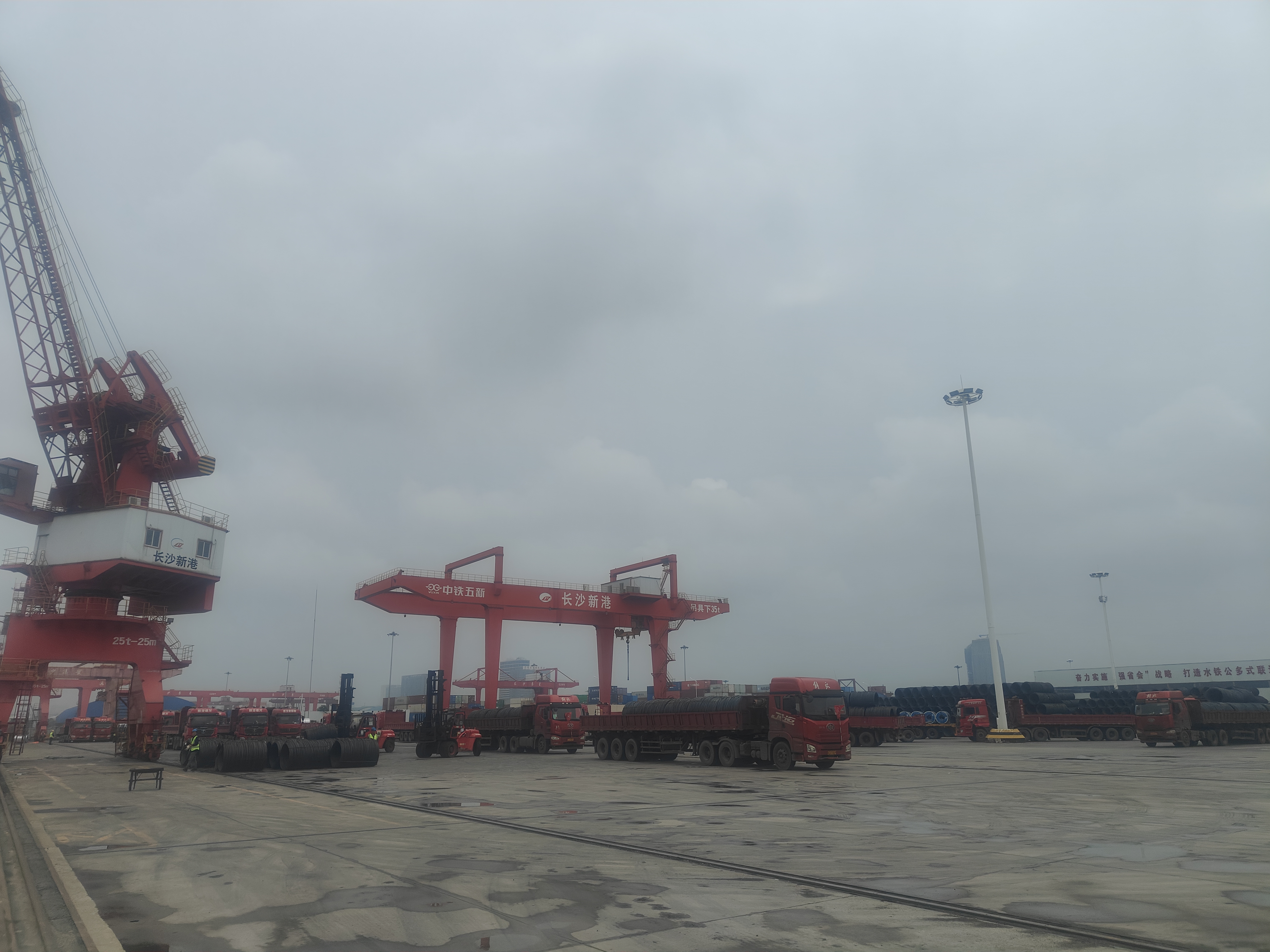 圖為“五一”期間,長(zhǎng)沙新港專用鐵路正在裝卸鋼卷