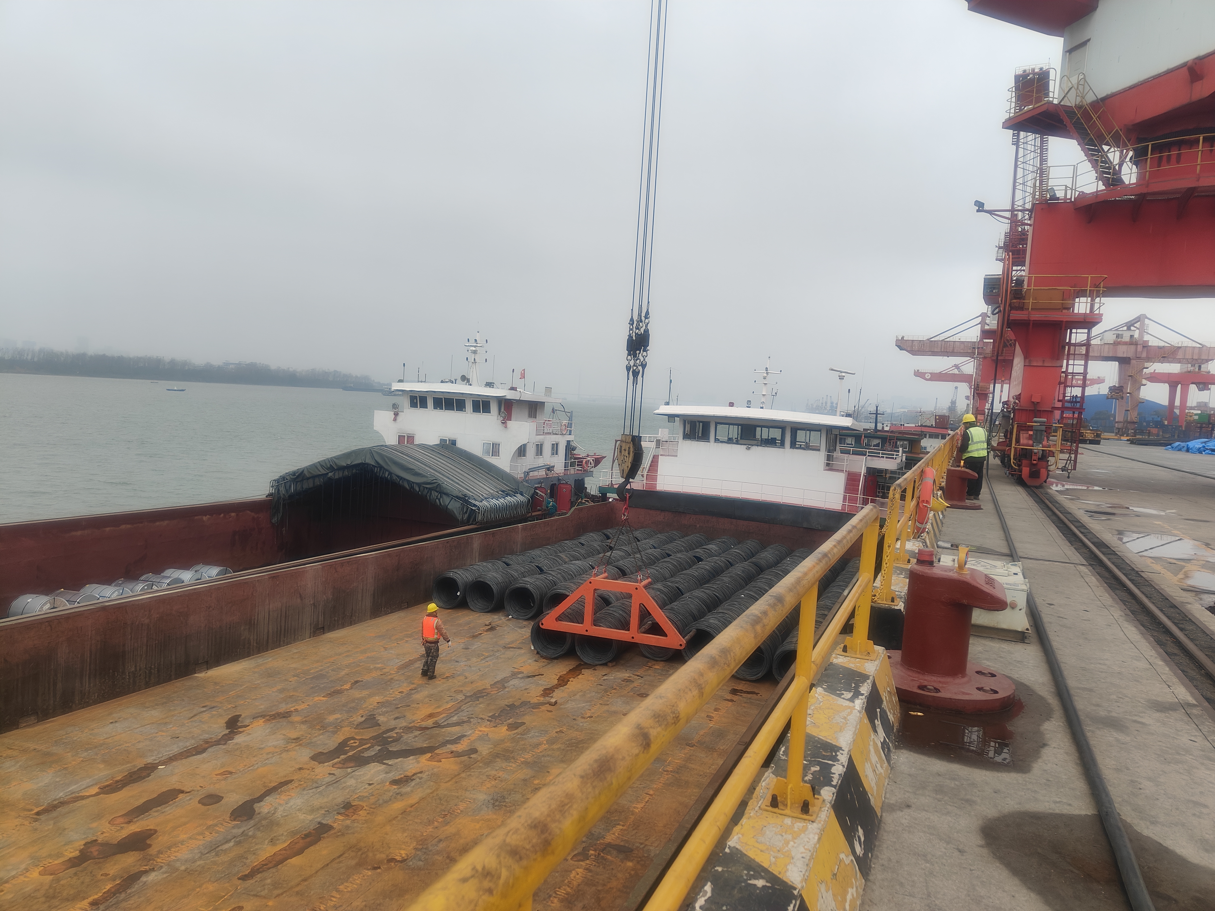 | 11月20日,湖南省城陵磯港口集團(tuán)長(zhǎng)沙新港公司1號(hào)吊現(xiàn)場(chǎng),裝卸人員正在利用四齒吊具進(jìn)行盤螺裝卸作業(yè),僅需2名裝卸人員用時(shí)3分鐘時(shí)間就將盤螺裝卸至指定位置。而這項(xiàng)工作在此之前需4名裝卸工人來(lái)完成。  據(jù)悉,以前各班組吊裝卸盤螺時(shí)大都采用鋼絲繩進(jìn)行吊裝,需要的裝卸人員多、勞動(dòng)強(qiáng)度大,用于吊裝盤螺的鋼絲繩損耗率較高。 為解決這個(gè)問(wèn)題,長(zhǎng)沙新港公司于11月1日定制了盤螺四齒吊具,生產(chǎn)、設(shè)備班組帶領(lǐng)技術(shù)骨干開(kāi)展革新攻關(guān),花費(fèi)近一周時(shí)間先對(duì)存放在我司貨場(chǎng)各個(gè)廠家生產(chǎn)的盤螺、線材進(jìn)行精確測(cè)量,再對(duì)接定制廠家,畫出吊具圖紙。通過(guò)不斷磨合、調(diào)試,目前該吊具已滿足我司絕大部分盤螺、線材裝卸船需求。隨著該吊具的全面投入使用,使作業(yè)面裝卸人員得到優(yōu)化、作業(yè)人員勞動(dòng)強(qiáng)度減少的同時(shí)還降低了鋼絲繩的損耗,進(jìn)一步保障了員工作業(yè)安全。后期通過(guò)不斷融合,作業(yè)效率將得到進(jìn)一步改善。 據(jù)了解,今年10月9日,長(zhǎng)沙新港公司自主改進(jìn)的元明粉噸袋吊具開(kāi)始投入使用。該吊具結(jié)合港口可持續(xù)發(fā)展理念,經(jīng)過(guò)不斷磨合改進(jìn),噸袋吊裝由原一次僅能吊裝4袋,到現(xiàn)如今可一次吊裝10袋,且該吊具能自動(dòng)取勾,使噸袋作業(yè)效率提升了50%,作業(yè)人員減少了25%。大大改善了以往噸袋作業(yè)貨物易破損的缺點(diǎn),確保了貨物、人員、機(jī)械的合理優(yōu)化配置。 長(zhǎng)沙新港公司始終堅(jiān)持從實(shí)際出發(fā),以工藝創(chuàng)新為引領(lǐng),找準(zhǔn)發(fā)展切入點(diǎn)和著力點(diǎn),不斷優(yōu)化作業(yè)流程,因地制宜發(fā)展港口新質(zhì)生產(chǎn)力,加快創(chuàng)新成果與現(xiàn)實(shí)生產(chǎn)力轉(zhuǎn)化,以技術(shù)創(chuàng)新推動(dòng)港口向智能化、綠色化轉(zhuǎn)型升級(jí),進(jìn)一步提升人機(jī)工效,推動(dòng)港口可持續(xù)發(fā)展! |