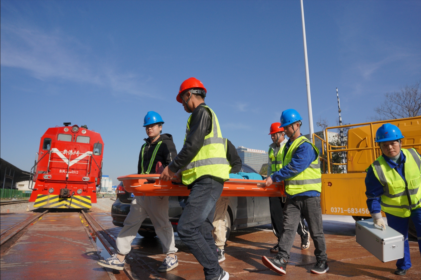 演練模擬長沙新港專用鐵路列車上行經(jīng)過3號鐵路道口時,與1輛沖卡搶道的機動車發(fā)生碰撞,導致機動車輛受損變形、起火、列車貨車車輛脫軌、人員受傷的應急處置。隨著演練總指揮的一聲令下,演練正式開始,公司安委辦接到事故報告后,按程序上報,公司主要負責人接報后立即宣布啟動公司一級應急響應。道口值守員撥打120、122請求醫(yī)療救援和交通事故處理,各應急救援小組趕赴現(xiàn)場按程序搶險救援,并通報相關(guān)單位部室暫停、調(diào)整作業(yè)計劃,同時做好信息報送、發(fā)布和輿情管控工作。