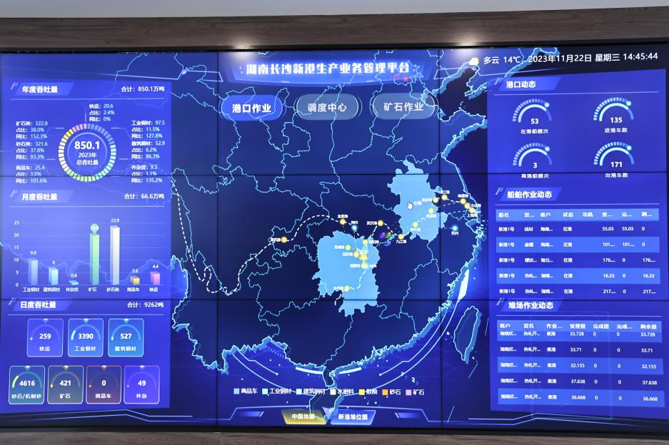 二、創(chuàng)新賦能:智慧綠色雙引擎驅(qū)動(dòng)升級(jí) 數(shù)字化轉(zhuǎn)型是長沙新港三年變革的鮮明注腳。2023年,長沙新港智控調(diào)度中心和生產(chǎn)業(yè)務(wù)管理平臺(tái)全面上線,實(shí)現(xiàn)船舶動(dòng)態(tài)監(jiān)測、港口實(shí)時(shí)監(jiān)控等智能化管理;2024年,“電永磁鐵吊具”等設(shè)備投產(chǎn),有效提升裝卸效率,降低人力成本;2025年,依托信息化平臺(tái)構(gòu)建“數(shù)字港+多式聯(lián)運(yùn)”模式,提高貨物周轉(zhuǎn)效率,縮短客戶報(bào)港、提貨流程。