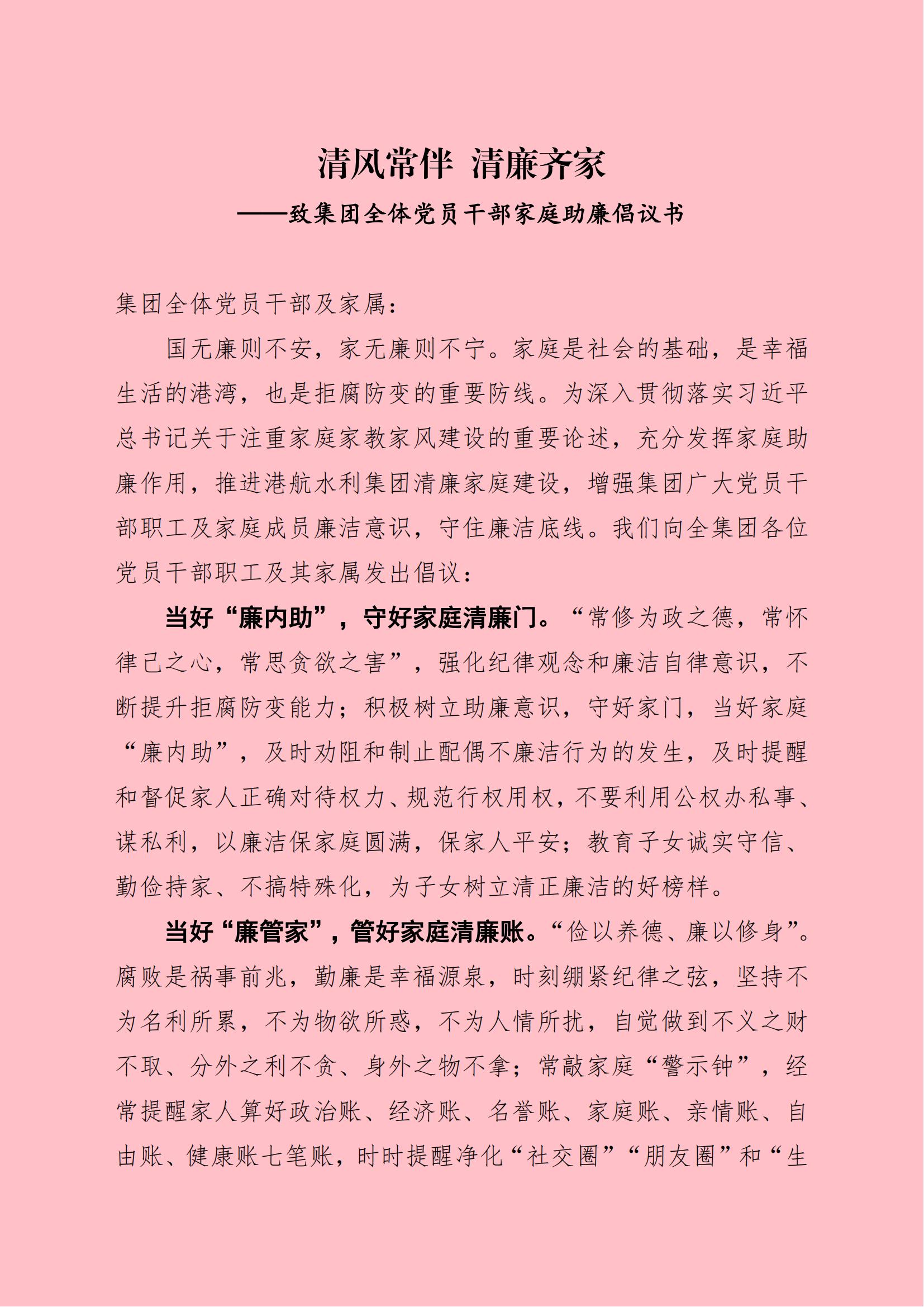 清風(fēng)常伴 清廉齊家—致集團(tuán)全體黨員干部家庭助廉倡議書