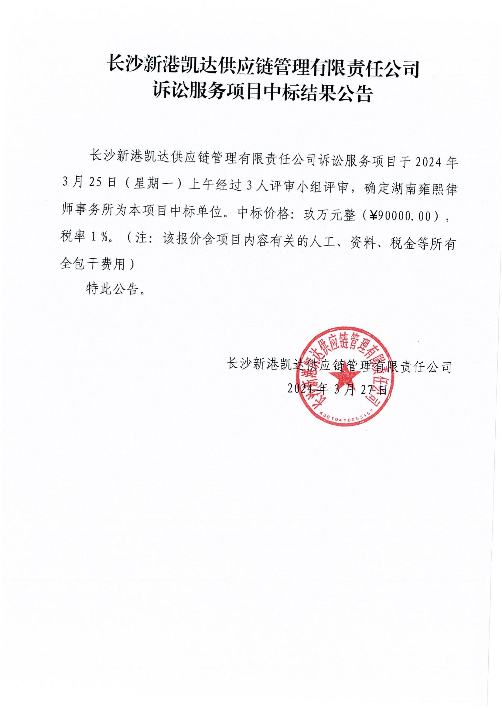長沙新港凱達(dá)供應(yīng)鏈訴訟服務(wù)項目中標(biāo)結(jié)果公告