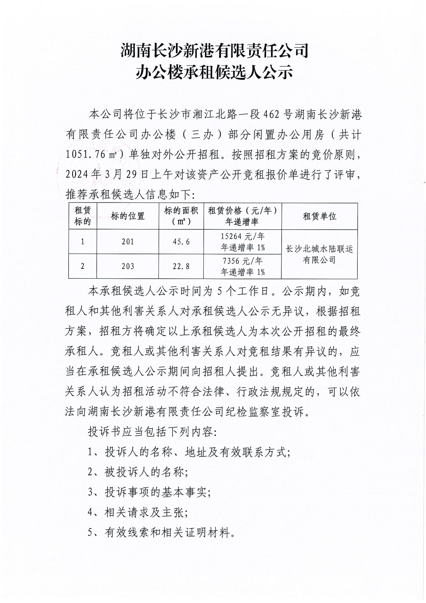 湖南長沙新港有限責(zé)任公司辦公樓承租候選人公示(201/203)