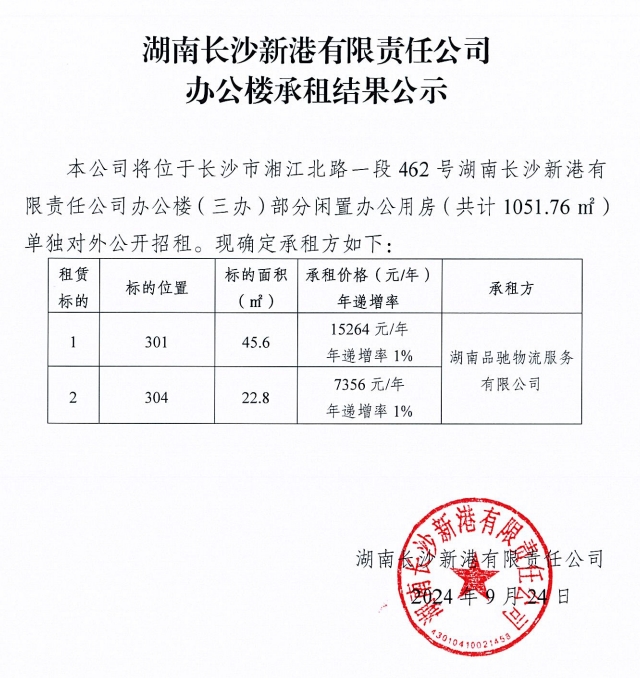 湖南長(zhǎng)沙新港有限責(zé)任公司辦公樓承租結(jié)果公示
