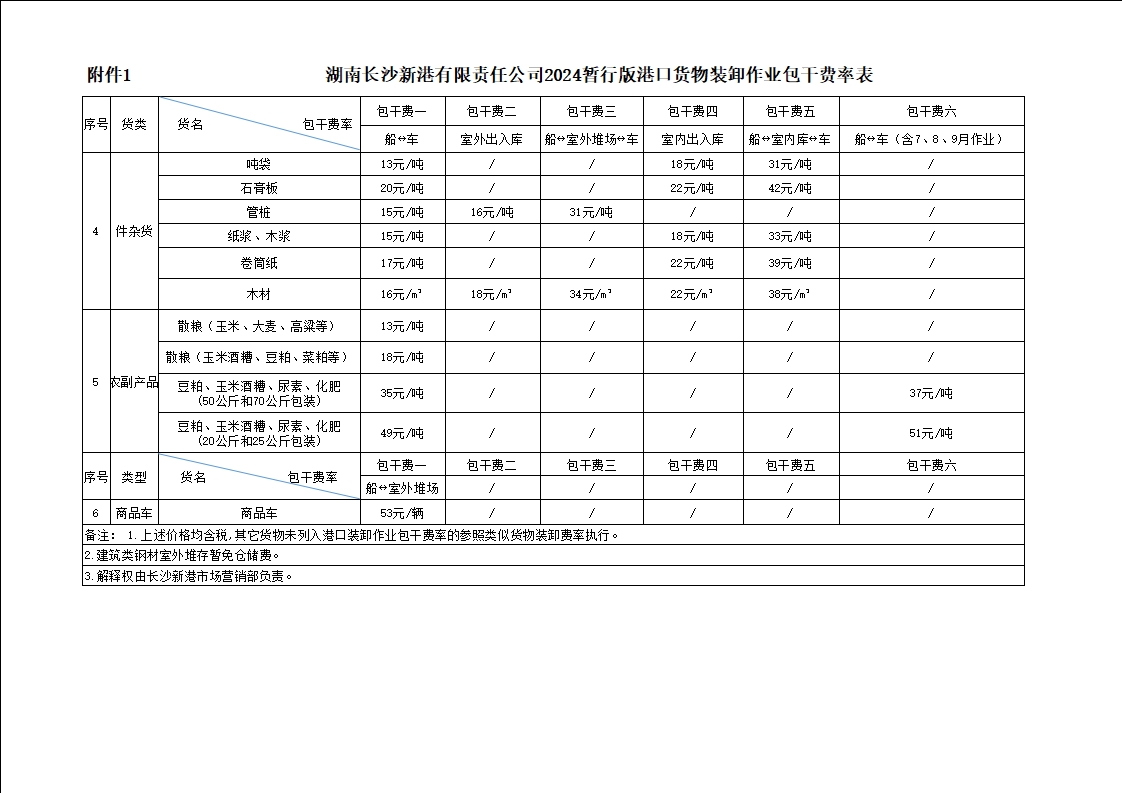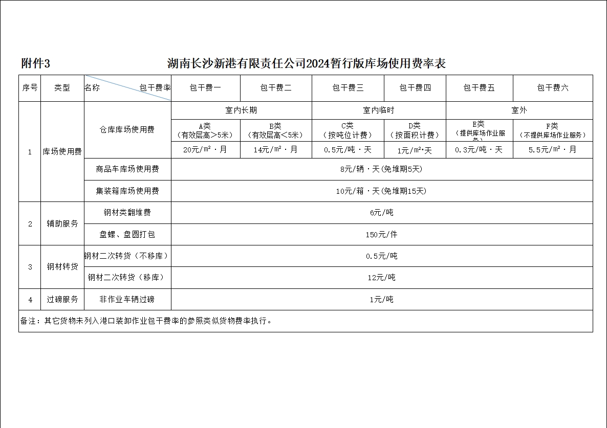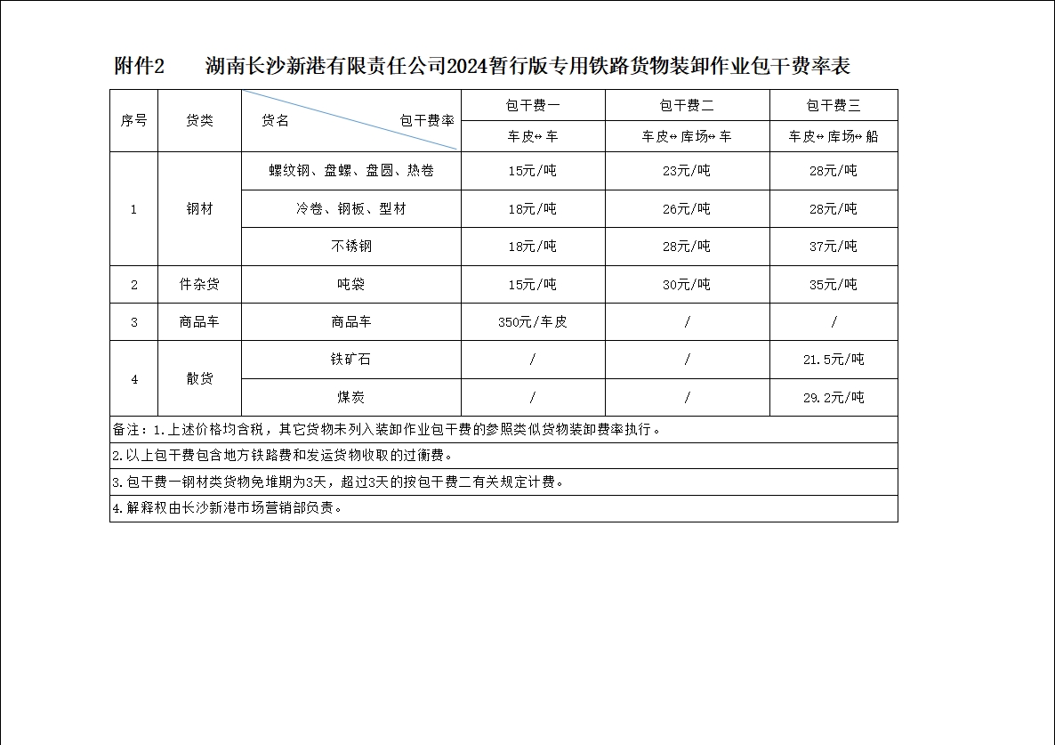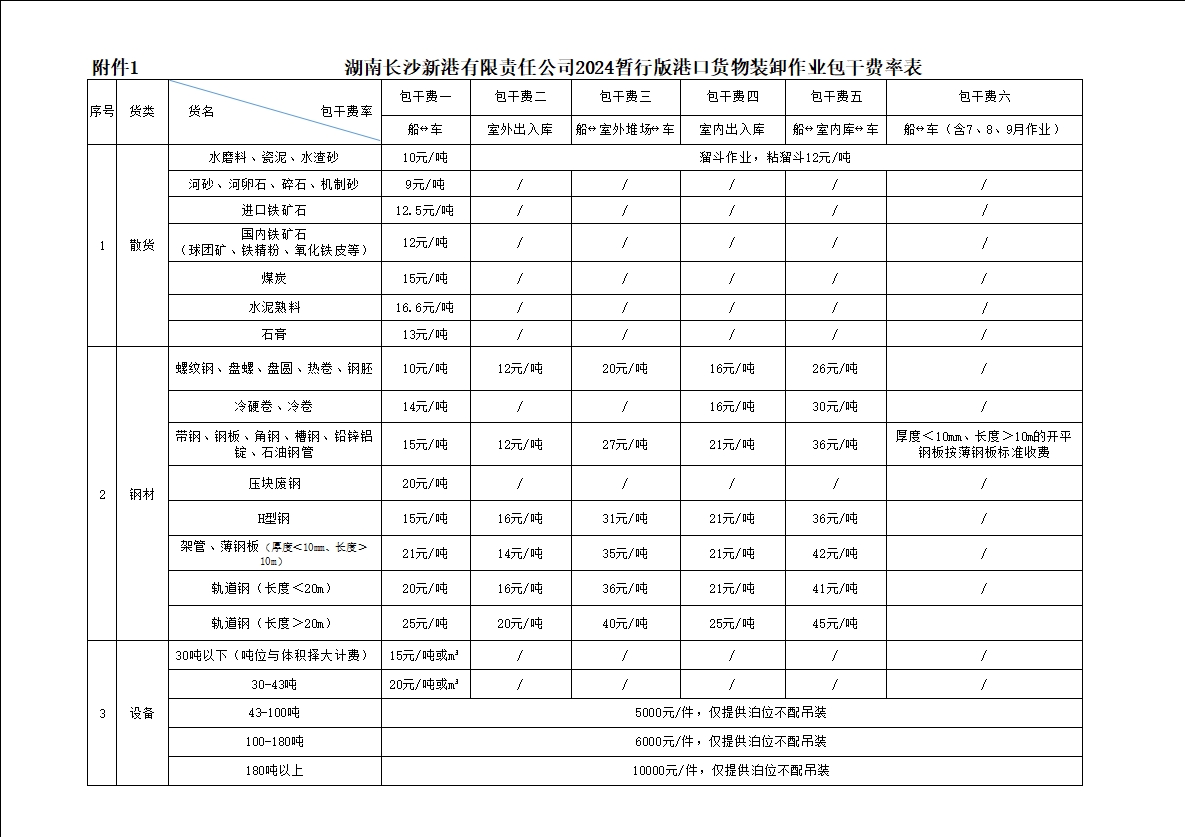 湖南長沙新港有限責(zé)任公司2024暫行版港口貨物裝卸作業(yè)包干費率、2024暫行版專用鐵路貨物裝卸作業(yè)包干費率、2024暫行版庫場使用費率及2024暫行版裝卸作業(yè)包干費率階梯價格方案
